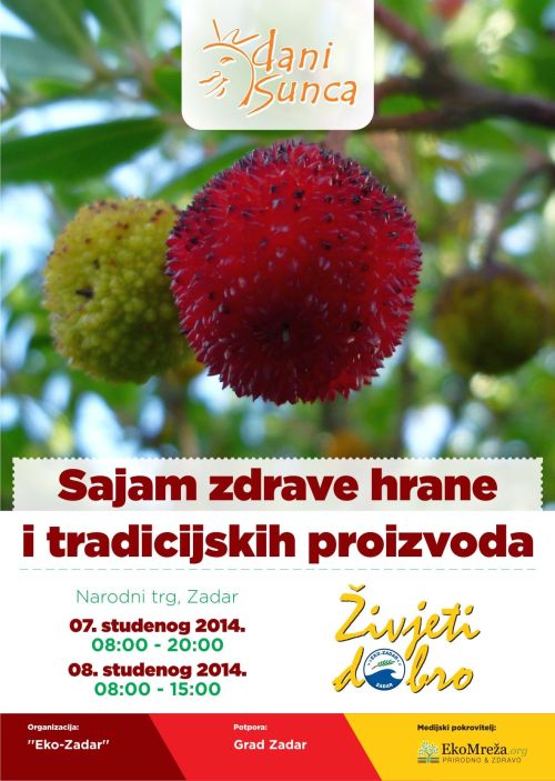 Sajam zdrave hrane i tradicijskih proizvoda „Dani sunca“ održat će se 7. i 8. studenog 2014. na Narodnom trgu u Zadru. Riječ je o trideset i trećem izdanju sajma kojeg, pod geslom „Živjeti dobro“, organizira udruga „Eko-Zadar“ . Uz to će se 8. studenog u vremenu od 10 do 13 sati održati i razmjena sjemenja. Riječ je o aktivnosti koju udruga periodično organizira u cilju očuvanja domaćeg sjemena, a ovog puta se provodi u sklopu projekta „Zelena transformacija“.