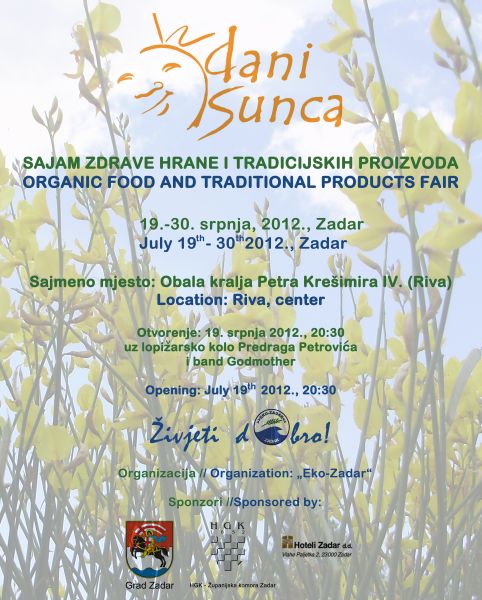 Od 19. do 30. srpnja 2012. održat će se 24. Sajam zdrave hrane i tradicijskih proizvoda „Dani sunca“ u organizaciji udruge “Eko-Zadar”. Sajam će se, kao i protekla dva održana u ljetnom terminu, odvijati na Obali kralja Petra Krešimira IV. u Zadru. Predstavit će se 16 proizvođača s područja šest županija i Grada Zagreba.