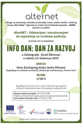 U sklopu projekta „AlterNET – Edukacijom i umrežavanjem do zaposlenja na ruralnom području“ u subotu 24. kolovoza 2019. u Zelengradu (Grad Obrovac) održat će se događanje „Info dan: Dan za razvoj“. Događanje će se održati  s početkom u 17 sati na lokaciji održavanja manifestacije „Prisnac fest“ ispred Doma Zavičajnog kluba Janko Mitrović.