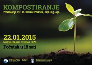 Udruga „Eko-Zadar“ 22. siječnja 2015. s početkom u 18 sati organizira predavanje na temu “Kompostiranje”. Predavačica je asistentica na Odjelu za ekologiju, agronomiju i akvakulturu Sveučilišta u Zadru mr. sc. Branka Perinčić, dipl.ing.agr., a predavanje će se održati u Multimedijalnoj dvorani Gradske knjižnice Zadar.