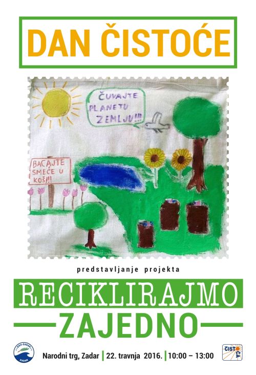 Dan cistoce plakat“Dan Čistoće“ je manifestacija je koja se jednom godišnje organizira od 2012. godine u sklopu projekta „Reciklirajmo zajedno“ u cilju upoznavanja javnosti s pravilnim odvajanjem otpada.  U razgovoru s djelatnicima/cama Čistoće d.o.o. svi koji posjete štand dobiti će odgovor na pitanje kamo odložiti koju vrstu otpada. Kući će moći ponijeti „Vodič o pravilnom odlaganju otpada na području Grada Zadra“, kao i žute vreće za odlaganje plastične nepovratne ambalaže.