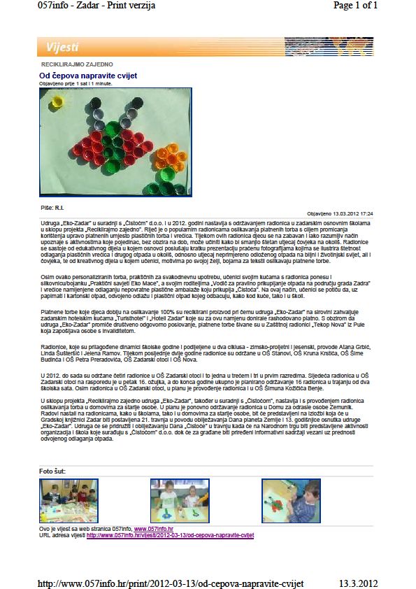 Udruga „Eko-Zadar” u suradnji s „Čistoćom” d.o.o. i u 2012. godini nastavlja s održavanjem radionica u zadarskim osnovnim školama u sklopu projekta „Reciklirajmo zajedno”. Riječ je o popularnim radionicama oslikavanja platnenih torba s ciljem promicanja korištenja upravo platnenih umjesto plastičnih torba i vrećica. Tijekom ovih radionica djecu se na zabavan i lako razumljiv način upoznaje s aktivnostima koje pojedinac, bez obzira na dob, može učiniti kako bi smanjio štetan utjecaj čovjeka na okoliš. Radionice se sastoje od edukativnog dijela u kojem osnovci poslušaju kratku prezentaciju praćenu fotografijama kojima se ilustrira štetnost odlaganja plastičnih vrećica i drugog otpada u okoliš, odnosno utjecaj neprimjereno odloženog otpada na biljni i životinjski svijet, ali i čovjeka, te od kreativnog dijela u kojem učenici, motivima po svojoj želji, bojama za tekstil oslikavaju platnene torbe.