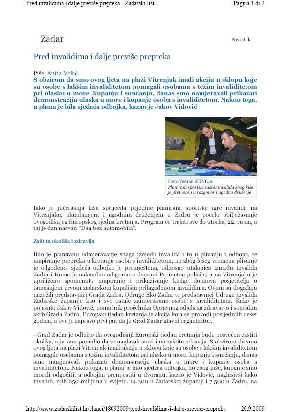 – Pred nama je plan grada na kojemu bi invalidi i svi ostali građani, koji imaju primjedbi i prijedloga, trebali označiti invalidima neprilagođena mjesta u gradu, kojih je, nažalost, jako puno. Ovom prilikom smo prikazali i fotografije na koje se vide neke od najvećih prepreka u prometu, a koje smo napravili uz pomoć studentice Marine Bure, osobe s invaliditetom, dok smo pratili njezin put od Studentskog doma do Sveučilišta, kazao je Ivan Genda, volonter u Udruzi Eko Zadar, naglasivši kako će, nakon što budu označeni na planu grada, svoje prijedloge poslati Gradu Zadru.
