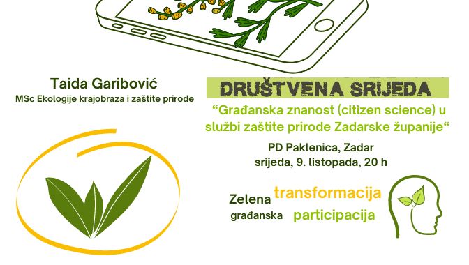 U suradnji s PD Paklenica, udruga „Eko-Zadar“ organizira predavanje „Građanska znanost (citizen science) u službi zaštite prirode Zadarske županije“. Predavanje će se održati u prostorijama PD Paklenica u ulici Majke Margarite 6 u Zadru u srijedu 9. listopada 2024. s početkom u 20 h. Predavačica je Taida Garibović MSc Ekologije krajobraza i zaštite prirode, idejna autorica aplikacije.