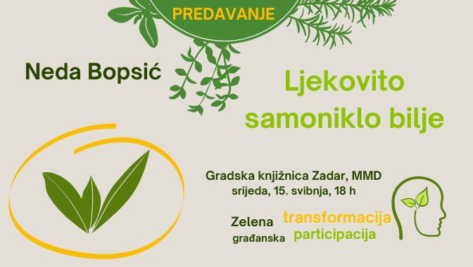 Vrsna poznavateljica samoniklog bilja, uključujući ljekovito samoniklo bilje, Neda Bopsić održat će predavanje u kojem će predstaviti samonikle ljekovite biljke koje rastu na našem području. Predavanje će se održati u multimedijalnoj dvorani Gradske knjižnice Zadar 15. svibnja 2024. godine s početkom u 18 h u sklopu projekta „Zelena transformacija – građanska participacija“ udruge „Eko-Zadar“. Ulaz na predavanje je, naravno – slobodan.