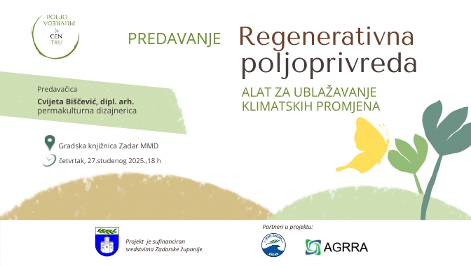 „Regenerativna poljoprivreda – alat za ublažavanje klimatskih promjena“ naziv je predavanja koje će permakulturna dizajnerica dipl. arh. Cvijeta Biščević održati u multimedijalnoj dvorani Gradske knjižnice Zadar u četvrtak, 27. studenog 2025. s početkom u 18 sati.