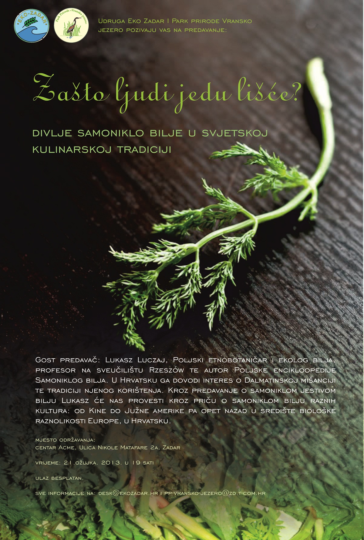 Gost predavač: Lukasz Luczaj, poljski etnobotaničar i ekolog bilja, profesor na Varšavskom sveučilištu, te autor Poljske encikloopedije Samoniklog bilja. U Hrvatsku ga dovodi interes o Dalmatinskoj mišanciji te tradijciji njenog korištenja. Kroz predavanje o samoniklom jestivom bilju Lukasz će nas provesti kroz priču o samoniklom bilju raznih kultura: od Kine do Južne amerike pa opet nazad u središte biološke raznolikosti Europe, u Hrvatsku.