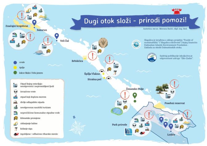 „Dugi otok složi – prirodi pomozi“ naziv je slagalice koja prikazuje devet vrijednih prirodnih područja na Dugom otoku i prijetnje s kojima se ova područja suočavaju. Autorica koncepta i teksta je mr.sc. Morana Bačić, dipl. ing. biologije, a slagalica je nastala u sklopu projekta „Slagalica održivosti“(„Puzzle of sustainability“) vrijednog 7.636,27 EUR kojeg financira Dalmatian Islands Environment Fundation (Zaklada za okoliš Dalmatinskih otoka).
