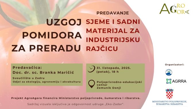„Uzgoj pomidora za preradu – sjeme i sadni materijal za industrijsku rajčicu“, naziv je predavanja kojeg će  doc. dr. sc. Branka Maričić s Odjela za ekologiju, agronomiju i akvakulturu na Sveučilištu u Zadru, održati u petak, 31. listopada 2025. s početkom u 18 sati u Poljoprivredno-edukacijskom centru u Zemuniku Donjem.