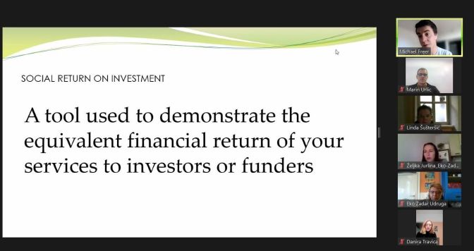 Tijekom listopada završen je ciklus webinara o društvenom poduzetništvu za četiri zaposlenice udruge „Eko-Zadar“. Ove online edukacije održane su u sklopu projekta „AktiBiz – društveno poduzetništvo udruga za stabilnu zajednicu“. 11. listopada 2021. godine održan je 3. webinar pod nazivom „Theory of change“ (Teorija promjene), a radi se o alatu koji pomaže u određivanju utjecaja djelovanja udruge na zajednicu. Postoje brojni alati za mjerenje utjecaja, a najpoznatiji među njima je SROI (Social return on investment) odnosno društveni povrat ulaganja o kojem je više riječi bilo u sklopu petog webinara održanog tjedan dana kasnije.